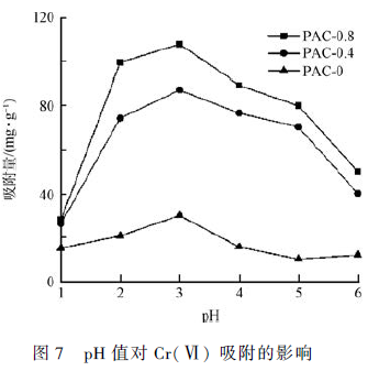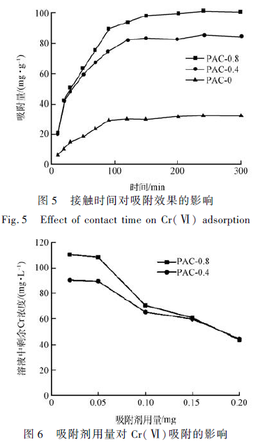 取50 mL 初始濃度為200 mg·L - 1 的Cr(Ⅵ)水溶液,分別投加0. 02、0. 05、0. 1、0. 15 和0. 20 g 3 種不同的吸附劑,24 h 后取樣過濾,測(cè)定吸光度,計(jì)算吸附量,考察吸附劑投加量對(duì)吸附效果的影響。在50 mL初始濃度為200 mg·L - 1 的Cr(Ⅵ) 水溶液中分別加入0. 05 g 的PAC-0. 8、PAC-0. 4、PAC-0. 0,用氫氧化鈉和鹽酸調(diào)節(jié)pH,24 h 后取樣過濾,測(cè)定吸光度,計(jì)算吸附量,考察pH 值在1 ~ 6 范圍內(nèi)對(duì)Cr(Ⅵ)吸附的影響。
