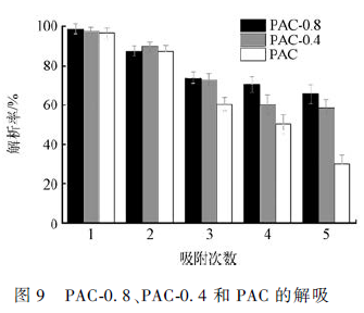 在實(shí)際應(yīng)用中,為了降低成本,往往將吸附劑重復(fù)使用。在本實(shí)驗(yàn)中也對(duì)吸附劑(PAC-0. 8、PAC-0. 4和PAC-0. 0)重復(fù)利用的效果進(jìn)行了實(shí)驗(yàn)驗(yàn)證,如圖9 所示。由圖9 可知,3 種吸附劑前3 次的解析效果均超過70% 以上,這說明ZnO 改性聚丙烯腈基活性炭吸附材料在實(shí)際過程中具有很好的可重復(fù)性,因而具有較好的實(shí)際應(yīng)用的可能。由圖9 可知,經(jīng)過3 次重復(fù)使用以后,其活性下降到60% 左右。具體參見污水寶商城資料或http://wlmqsb.com更多相關(guān)技術(shù)文檔。