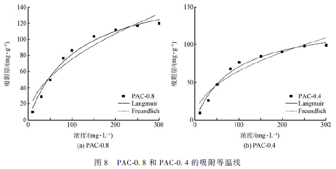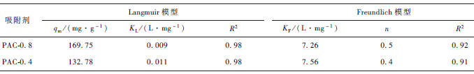 分別采用Langmuir 模型和Freundlich 模型對(duì)PAC-0. 8 以及PAC-0. 4 進(jìn)行非線性擬合,其結(jié)果如圖8 所示。由表1 中確定的相關(guān)系數(shù)R2 可知,Langmuir模型比Freundlich 模型對(duì)PAC-0. 8 和PAC-0. 4 的吸附行為的擬合效果更好,其R2 值可以達(dá)到98% ,說明單層吸附的模式可能在這個(gè)材料去除Cr 的過程中占有主導(dǎo)作用。