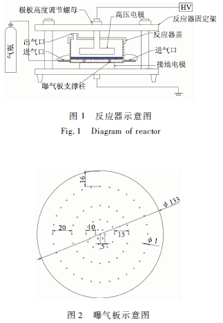 實驗采用圖1所示的石英DBD反應(yīng)器,外徑140mm,內(nèi)徑134 mm,高度100 mm,底板厚2 mm,內(nèi)部有4個長度為15 mm直徑為6 mm的石英柱8固定在反應(yīng)器內(nèi)壁用來支撐曝氣板。反應(yīng)器壁上有2個石英制成的進(jìn)氣管3,實驗氣體(空氣,O2)由2個進(jìn)氣管進(jìn)入反應(yīng)器。