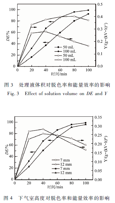 一方面,電極間距加大,放電空間內(nèi)的電場強(qiáng)度下降,在輸入電壓相同的條件下,下氣室高度從7 mm增加到12 mm,輸入功率從18 W下降到15 W。輸入電能減少,使放電空間中活性物質(zhì)減少,導(dǎo)致脫色率和能量效率下降。