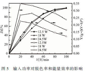 一方面,隨初始濃度的增加,MB降解產(chǎn)生的中間產(chǎn)物的濃度增加。MB與中間產(chǎn)物都和等離子體產(chǎn)生的活性物質(zhì)反應(yīng),但在相同的輸入功率下活性物質(zhì)的濃度為定值,因此在高濃度的MB溶液中,脫色率較低,但由于高濃度的MB溶液中MB分子的數(shù)量較多,有更多的機(jī)會與活性物質(zhì)發(fā)生作用,因此高濃度的溶液的能量效率較高。另一方面,隨著溶液濃度的增加溶液的透光性變差,降低了紫外光對溶液的作用,也是導(dǎo)致脫色率下降的另一原因。MACUREANU等在用DBD反應(yīng)器降解己酮可可堿(pentoxifylline)的研究中也得到了相似的結(jié)果。
