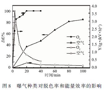 實驗采用初始濃度為100 mg/L,體積50 mL,初始pH為4. 0,電導(dǎo)率為150 μS /cm的MB溶液,分別采用空氣、O2曝氣,氣體流量60 SCCM,上、下氣室高度分別為7. 5和7 mm,輸入電壓6 kV。如圖8所示,氧氣可以在20 min內(nèi)使MB的脫色率達(dá)到99. 98 %,而空氣需要100 min才能將MB脫色85.3 %。氧氣曝氣時,處理3min能量效率最高,最高可達(dá)3.63 g / (kW · h),而空氣曝氣時最大能量效率在20 min時達(dá)到最大,最大能量效率為0. 31 g / (kW · h)。