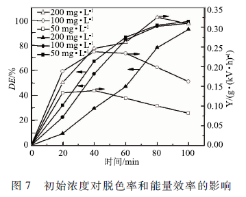 實驗采用50 mL初始pH為4. 0,初始濃度分別為50,100和200 mg/L ,電導(dǎo)率分別為84,150和200 μS /cm的MB溶液,空氣流量60 SCCM,上、下氣室高度分別為7. 5和7 mm,輸入電壓6 kV。如圖7所示,MB的脫色率隨初始濃度的增加而下降,而能量效率隨初始濃度的增加而升高。