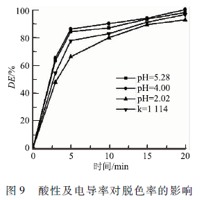 從2. 4的研究中可知酸性pH下MB的脫色率和能量效率都較高。為了進(jìn)一步研究酸性的增加對MB降解的促進(jìn)作用和NO的產(chǎn)生導(dǎo)致的反應(yīng)中毒(含氧活性物質(zhì)濃度的下降、電導(dǎo)率的升高)對MB的影響。在氧氣條件下,處理初始濃度為100 mg/L的MB溶液,分別調(diào)節(jié)MB溶液的pH為2. 02(空氣處理100 min時的pH為2. 07 ) 、4. 00和5. 28(不加硫酸的MB溶液的pH ),在pH為4. 00的溶液中加入硫酸鈉調(diào)節(jié)初始電導(dǎo)率(k)至1 114 μS / cm ,得到圖9。酸性增強(qiáng)對MB降解并不總是有利的,在pH從5. 28下降到4. 0時,MB的脫色率增加,但是當(dāng)pH進(jìn)一步下降到2. 02時,溶液的脫色率顯著下降。pH為5.28、4. 00和2. 02時溶液的電導(dǎo)率分別為64 、 150和4. 08 mS / cm 。強(qiáng)酸性條件不利于MB的降解,是由于電導(dǎo)率升高導(dǎo)致電場強(qiáng)度下降,等離子體隧道難于形成,活性物質(zhì)濃度下降,從而導(dǎo)致的MB的脫色率在強(qiáng)酸性條件下較低。電導(dǎo)率升高導(dǎo)致的MB降解抑制效應(yīng),在加入硫酸鈉調(diào)節(jié)初始pH為4. 0的MB溶液的電導(dǎo)率k=1 114 μS / cm 降解MB溶液的實驗中,得到脫色率下降的結(jié)果中得到進(jìn)一步的證實。因此,酸性的增強(qiáng)對MB降解的促進(jìn)作用與酸性增強(qiáng)導(dǎo)致的電導(dǎo)率升高對MB降解的抑制作用相比較弱。因此,空氣曝氣時NOx的產(chǎn)生,導(dǎo)致的酸性效應(yīng)并不能加強(qiáng)MB的降解,NOx的產(chǎn)生導(dǎo)致的反應(yīng)中毒(氧化性物種中毒以及電導(dǎo)率升高等)是使MB的降解效率下降另一重要原因。