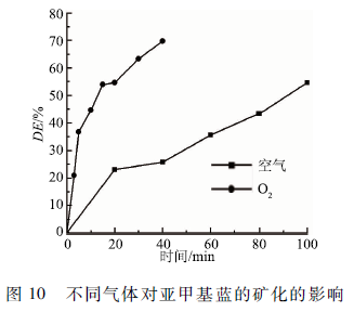 與圖8中的DE隨時間的變化曲線對比可知,MB的礦化比降解要慢許多。這是由于MB經(jīng)過一系列的復(fù)雜的反應(yīng),生成許多有機(jī)中間體,由于MB分子相對容易被氧化,而生成的有機(jī)中間體比MB分子結(jié)構(gòu)更加穩(wěn)定,這些中間體與反應(yīng)系統(tǒng)中的活性物質(zhì)反應(yīng)被降解的難度加大。因此,反應(yīng)物系中有機(jī)物的礦化比MB的脫色更加困難,礦化速率相對較慢。