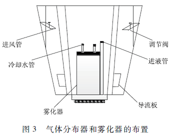 氣體分布器和霧化器的布置如圖3所示,熱空氣通過若干進(jìn)風(fēng)管和調(diào)節(jié)閥的控制均勻進(jìn)入進(jìn)風(fēng)通道中,通過導(dǎo)流板的調(diào)節(jié)呈一定角度旋轉(zhuǎn)并與旋流霧化器出來的霧滴進(jìn)行充分接觸和強(qiáng)烈的傳質(zhì)傳熱反應(yīng)。