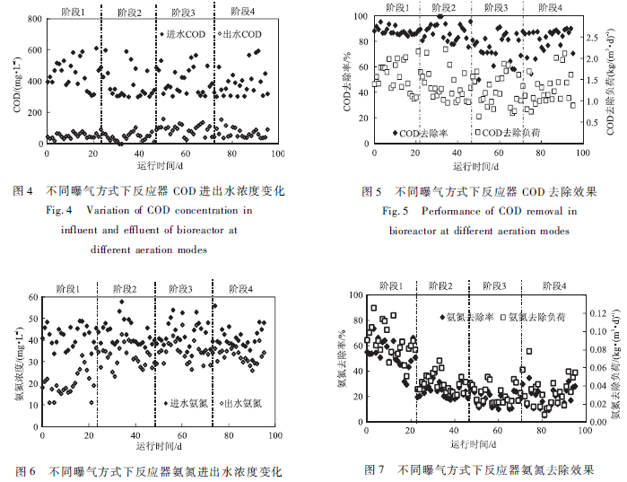 不同曝氣方式下反應(yīng)器進(jìn)出水氨氮濃度、氨氮去除率和氨氮去除負(fù)荷如圖6和7所示。階段1一階段4,平均氨氮出水濃度分別為19.6,32.9,34.7和32.9 mg / L;平均氨氮去除率分別為53. 4% ,24.8%,18.5%和20.0%;平均氨氮去除負(fù)荷分別為0. 089 , 0. 043 , 0. 031和0. 034 kg / ( m3 · d)?梢(jiàn),階段1一階段4隨著停曝時(shí)間的增加,DO濃度下降,硝化活性受到抑制,氨氮的去除效果降低,DO濃度與氨氮去除負(fù)荷存在極顯著正相關(guān)關(guān)系(R=0.997 ,P <0.01)。階段4氨氮去除效果略優(yōu)于階段3,可能由于階段4曝氣周期DO濃度波動(dòng)(0. 15一1.22mg/L)大于階段3(0.42一0. 65 mg / L),能夠出現(xiàn)較高DO濃度環(huán)境,且平均DO濃度略高,硝化活性抑制相對(duì)較弱。