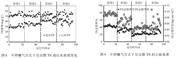 反應(yīng)器內(nèi)SND過(guò)程有利于TN去除。不同曝氣方式下反應(yīng)器進(jìn)出水TN濃度、TN去除率和 TN去除負(fù)荷如圖8和9所示。階段1一階段4,平均TN出水濃度分別為30. 0 、35. 1 、40. 2和39. 0 mg / L ;平均TN去除率分別為43.4% ,32.8% ,22. 0%和26.5 %;平均TN去除負(fù)荷分別為0. 092 、 0. 069 、 0. 045和0. 057 kg/(m3·d) 。