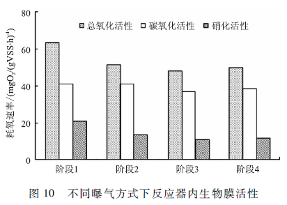 階段1一階段4運(yùn)行末期取填料上生物膜樣品,測(cè)定各階段生物膜耗氧速率,以反映其好氧生物活性變化,結(jié)果如圖10所示。階段1一階段4,生物膜總氧化活性分別為63. 03 、51. 32 、47. 74和49. 66 mg O2·(gVSS·h)-1;碳氧化活性分別為41. 11、 40. 82、36. 93和38. 21 mg 02·( g VSS·h)-1;硝化活性分別為20. 92、13. 50 、10. 81和11. 45 mg O2 · ( g VSS · h) -1?梢(jiàn),階段1一階段4隨著停曝時(shí)間的增加和DO濃度降低,生物膜好氧生物活性有所降低,特別是硝化活性下降更為顯著。同時(shí),生物膜好氧生物活性降低與COD和氨氮去除效果下降的趨勢(shì)相一致。