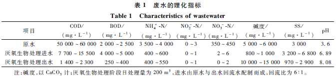 廢水來自某集團(tuán)纖維素乙醇中試基地的生產(chǎn)廢水,以玉米秸稈為原料,采用稀酸蒸汽爆破預(yù)處理、水洗過濾、酶解、C6單獨(dú)發(fā)酵工藝得到乙醇,發(fā)酵液經(jīng)蒸餾提取乙醇后的塔釜醒液稱之為纖維素乙醇廢水。纖維素乙醇廢水水質(zhì)可見表1,在對(duì)該廢水進(jìn)行脫氮處理之前需通過厭氧生化處理,降低廢水中有機(jī)物、色度對(duì)硝化階段的影響,本實(shí)驗(yàn)用水就是經(jīng)過厭氧生物處理后的廢水。由于纖維素乙醇廢水水質(zhì)波動(dòng)大,經(jīng)厭氧生化處理的出水水質(zhì)也有較大變化,其主要水質(zhì)理化指標(biāo)見表1。