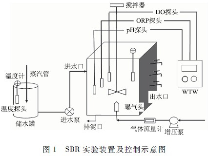 實(shí)驗(yàn)裝置為不銹鋼材質(zhì)的長(zhǎng)方反應(yīng)器,長(zhǎng)1 250 mm,寬800 mm,高1 500 mm,四壁設(shè)有保溫夾層,其中正面設(shè)有3個(gè)采樣日,反應(yīng)器有效容積1 000 L,總?cè)莘e1 500 L。反應(yīng)器內(nèi)配有可提升管式微孔曝氣器,采用鼓風(fēng)曝氣,并通過轉(zhuǎn)子流量計(jì)調(diào)節(jié)曝氣量。在SBR的頂部設(shè)置有精密加力電動(dòng)攪拌機(jī),在反硝化階段啟動(dòng),使泥水完成混合并加快反硝化反應(yīng)的進(jìn)程。在反應(yīng)器底部設(shè)有2個(gè)排泥口,必要時(shí)通過排泥口排泥。