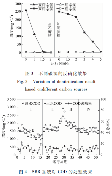 在反應(yīng)器啟動(dòng)后,從第17周期(階段II)開始加入反硝化階段。在階段II,為了培養(yǎng)反硝化菌,先對(duì)進(jìn)水進(jìn)行缺氧處理(前置反硝化),在階段III , IV,運(yùn)行方式改為先進(jìn)行短程硝化后反硝化,并且分別投加葡萄糖和乙酸鈉作為外加碳源。反應(yīng)器進(jìn)水三氮(氨氮、亞硝酸鹽氮和硝酸鹽氮)在98一458 mg / L之間波動(dòng),平均值為274 mg / L 。從圖2看出,NH4+ -N去除雖有波動(dòng),但去除率基本保持在80%以上,出水NO2- -N濃度約為192一259 mg / L ,三氮的去除率在25%以下,說明這一階段反硝化效果不佳。在階段III (29一39周期),投加葡萄糖作為碳源,出水NO2- -N濃度迅速由154降低至29mg / L,三氮去除率升高至60%左右,最高達(dá)到73 %,說明此時(shí)反硝化菌馴化成功。這一階段反硝化過程需要5一10 h才能完成,為了減少反硝化反應(yīng)時(shí)間,提高反硝化效率,從第40周期開始投加乙酸鈉為碳源。周期實(shí)驗(yàn)發(fā)現(xiàn),使用乙酸鈉后反硝化過程在2h內(nèi)即可完成,穩(wěn)定運(yùn)行后出水NO2- -N濃度低至3 mg / L以下,出水三氮平均值為49 mg / L ,三氮去除率穩(wěn)定在70%以上,NH4+ -N去除率和三氮去除率保持高度一致,說明此時(shí)反硝化效果十分穩(wěn)定。曾薇等采用A2O工藝處理低C/N比實(shí)際生活污水,在反硝化階段投加乙酸鈉和丙酸鈉的混合物為碳源,系統(tǒng)對(duì)總氮(TN)的去除率高達(dá)75. 4%,此報(bào)道和本文的研究結(jié)果較接近。