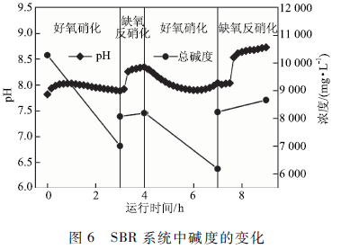 纖維素產(chǎn)乙醇廢水經(jīng)厭氧處理后堿度大幅增加,SBR反應(yīng)器進(jìn)水堿度可達(dá)10 290 mg / L,氨氮濃度約為213 mg / L。由圖6可知,在2次硝化反應(yīng)過程中,堿度均呈下降趨勢(shì),最終降至6 206 mg / L,pH值也相應(yīng)降低,這是因?yàn)橄趸磻?yīng)產(chǎn)生的H十消耗掉了部分堿度,導(dǎo)致系統(tǒng)中堿度減少。亞硝態(tài)氮積累到一定程度(≤100mg / L )后停止曝氣,投加適量乙酸鈉為反硝化細(xì)菌提供碳源,使得堿度增加,這是因?yàn)橐宜徕c作為碳源補(bǔ)償了所消耗的堿度,保證了反硝化反應(yīng)的順利進(jìn)行。