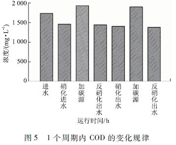 周期實(shí)驗(yàn)將一個(gè)SBR運(yùn)行周期(從進(jìn)水到出水)分成2個(gè)子周期,每個(gè)子周期包括好氧和缺氧2個(gè)階段,分別進(jìn)行曝氣和缺氧攪拌,形成好氧/厭氧的周期運(yùn)行方式。由圖5可知,經(jīng)過2次硝化反硝化反應(yīng),體系中COD由1 786降至1 440 mg / L,去除率為19.3% ,B/C比由0. 157降至0. 036,可見處理后廢水可生化性極低。圖5中還可看出,2次硝化出水和反硝化出水中COD含量基本一致,說明經(jīng)過硝化反應(yīng)剩余COD很難再被反硝化細(xì)菌利用。結(jié)合4個(gè)階段運(yùn)行參數(shù)的調(diào)整情況可知,無論曝氣時(shí)間長(zhǎng)短、曝氣量大小以及有無外加碳源,系統(tǒng)對(duì)COD的去除率始終維持在20%上下。分析認(rèn)為,纖維素乙醇廢水中纖維素、半纖維素、木質(zhì)素含量較高,且纖維素具有高度的序晶體結(jié)構(gòu),須經(jīng)過深度處理,破壞晶體結(jié)構(gòu),降低聚合度。為了進(jìn)一步去除COD,胡豫娟等利用Fenton氧化法深度處理纖維素乙醇廢水,獲得了良好的COD去除效果。
