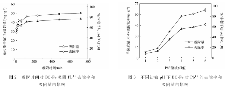 BC-Fe對Pb2+的吸附較快,在吸附時間為5 min時已經(jīng)達到吸附總量的50%以上,2h時已達到吸附平衡。去除率以及單位質(zhì)量吸附量的變化趨勢一致。隨著吸附時間的延長,BC-Fe對Pb 2+的去除率逐漸增加,在吸附時間為2h時達到81.3%,繼續(xù)延長吸附時間,去除率增幅較小,在12h時達到87.6%,增加了6. 3 %。單位質(zhì)量的BC-Fe對Pb2+的吸附量在吸附時間為2h時達到40. 6 mg / g ,基本達到飽和吸附狀態(tài),而后隨吸附時間的延長,在12h時達到43. 8 mg / g,比2h時增加了3.2 mg。溶液中吸附劑與吸附質(zhì)的結合是一個漸進過程,需要一定的時間才能達到平衡。由于BC-Fe對Pb2+的吸附可能存在多種吸附機理,推測在初始吸附階段,主要發(fā)生的是表面吸附,物理吸附占主導地位,Pb2+能快速占據(jù)BC-Fe表面的活性位點,隨著吸附時間的延長,BC-Fe表面的活性位點減少,吸附量以及去除率增幅較為緩慢最后達到平衡。