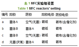如表 1所示,實(shí)驗(yàn)設(shè)計4種MFC構(gòu)型,菌體A為AnAOB菌,菌體B為乙酸鹽降解菌,其中a、b-MFC分別為陽極型和陰極型Anammox-MFC實(shí)驗(yàn)組;c、d-MFC的設(shè)計旨在與b-MFC對比,進(jìn)行Anammox陰極與傳統(tǒng)的空氣陰極各方面性能的比較,同時探究乙酸鹽降解菌陽極對反應(yīng)體系的作用. 其中,為了保證空氣陰極性能的可比性,對a、c-MFC空氣陰極碳布材料靠近陰極液的一側(cè)涂抹0.5 mg·cm-2的10%鉑碳催化層(羅凈凈等,2016),同時使空氣陰極液與其對應(yīng)的陽極液底物濃度相同,以避免質(zhì)子交換膜兩端電導(dǎo)率差別對實(shí)驗(yàn)結(jié)果造成影響,并調(diào)節(jié)空氣陰極液初始pH為3.0,以促進(jìn)其O2還原. 各實(shí)驗(yàn)組全周期置于(33±1)℃的恒溫培養(yǎng)箱(賽福SPX-250)中.