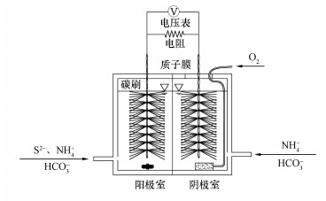 厭氧消化技術目前廣泛用于污泥及高濃度有機廢水的處理并可回收沼氣, 但厭氧消化液中存在高濃度氨氮及硫化物.研究發(fā)現(xiàn), 某些工業(yè)廢水如制革廢水和采礦廢水等也會產生高濃度的硫化物及氮素污染物(Guo et al., 2016).硫化物具有臭味和腐蝕性, 會嚴重影響人體健康及生活環(huán)境, 氮素污染物則是水體富營養(yǎng)化的主要誘因, 因此, 這些廢水排放前需除硫脫氮.近年來出現(xiàn)的微生物燃料電池(Microbial Fuel Cell, MFC)可在去除污染物的同時回收電能, 在廢水脫氮或廢水除硫領域具有較好的發(fā)展前景(Sun et al., 2016; Zhao et al., 2008).前期的MFC除硫多采用化學陰極, 以高錳酸鉀或鐵氰化鉀為電子受體(Cai et al., 2015; Lee et al., 2012), 易產生二次污染.以S2-作為陽極電子供體, NO3-為陰極電子受體, 可在單一的反硝化除硫MFC內分別完成陽極除硫與陰極脫氮(魏炎等, 2016), 具有處理含S2-/NH4+廢水的潛力.
