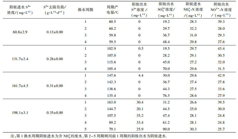 如表 2所示, S2-去除負荷隨進水S2-濃度的增加而增加, 但進水S2-濃度為(161.7±4.5) mg·L-1時第1周期出水有少量S2-殘余(4.4 mg·L-1), 進水S2-濃度為(198.1±3.1) mg·L-1時各周期出水均有較多的S2-殘余(20.1~35.2 mg·L-1), 表明進水S2-濃度不宜超過161.7 mg·L-1.陽極出水SO42-濃度隨換水周期數(shù)及進水濃度的增加而增加.進水S2-濃度為(60.8±2.9)、(131.7±2.4)、(161.7±4.5)、(198.1±3.1) mg·L-1時, 根據(jù)SO42-驟升確定相應的碳刷清洗周期分別為3、3、3和4個換水周期.本研究中陽極未接種污泥, 但陽極進水也未滅菌處理, 因此, MFC長期運行過程中仍可能引入硫氧化菌, 并在陽極室器壁及質子膜上繁殖.與無菌對照試驗相比(表 1), 相近進水濃度下MFC的S2-去除率和SO42-產量更高.其主要原因在于:① 陽極室器壁及質子膜上硫氧化菌的生物氧化作用加速了S2-的去除和SO42-的生成; ② 陰極電活性微生物的電化學作用推動了陽極S2-的去除和SO42-的生成.