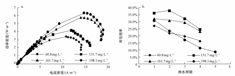 圖 2 不同進水S2-濃度下MFC的功率密度曲線(a)和陽極庫侖效率(b)