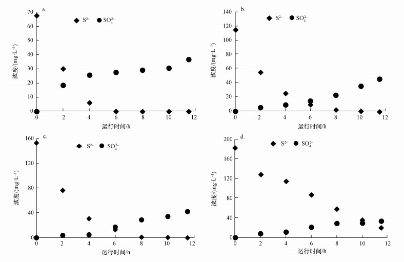 圖 3 不同進水S2-濃度下最后一個換水周期內的S2-和SO42-濃度變化(a.(60.8±2.9) mg·L-1條件下的第3個周期, b.(131.7±2.4) mg·L-1條件下的第3個周期, c.(161.7±4.5) mg·L-1條件下的第3個周期, d.(198.1±3.1) mg·L-1條件下的第4個周期)