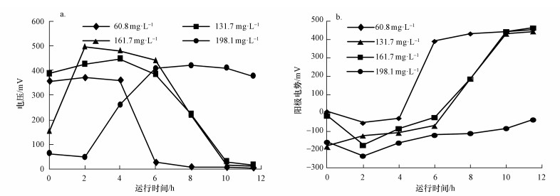 如圖 4所示, 各進水濃度下的MFC輸出電壓和陽極電勢與陽極S2-濃度密切相關.結合圖 3與圖 4發(fā)現(xiàn), 陽極S2-濃度低于6.2~17.4 mg·L-1時, 陽極電勢上升至-23~-70 mV, 電壓值開始快速下降.陽極S2-耗盡( < 0.5 mg·L-1)時, 陽極電勢變?yōu)檎? 但電壓并未降至0 mV(16~31 mV), S通過電化學作用進一步氧化成SO42-是MFC繼續(xù)產電的原因.由圖 4a可知, 每個進水S2-濃度下最后1個運行周期內MFC的輸出電壓總體呈先上升后下降的趨勢, 更換廢水后MFC需重新適應相應濃度的水質, 因此, 初始電壓并非最高值, 后期隨著S2-的消耗則電壓逐步下降.進水S2-濃度為(198.1±3.1) mg·L-1時, 后期未出現(xiàn)電壓下降, 則是由于11.5 h后仍有充足的電子供體S2- (20.8 mg·L-1).以硫化物和葡萄糖為陽極基質的MFC分批試驗中存在類似的電壓變化趨勢(Zhang et al., 2009).增加進水濃度有利于MFC電壓升高并延長穩(wěn)定產電時間.進水S2-濃度為(60.8±2.9)、(137.1±2.4) 和(161.7±4.5) mg·L-1時, 換水周期內穩(wěn)定電壓的持續(xù)時間分別為4、6和6 h, 相應的最高電壓分別為371、447和496 mV.進水S2-濃度升為(198.1±3.1) mg·L-1時, 11.5 h后仍可穩(wěn)定產電( > 377 mV), 但上個換水周期陽極出水殘余的S2-進入陰極后會抑制陰極反應, 導致最高電壓回降到419 mV.綜合MFC的產電與污染物去除情況, 進水S2-濃度為(60.8±2.9)、(137.1±2.4) 和(161.7±4.5) mg·L-1時的換水周期時間可分別縮短為6、8和8 h.