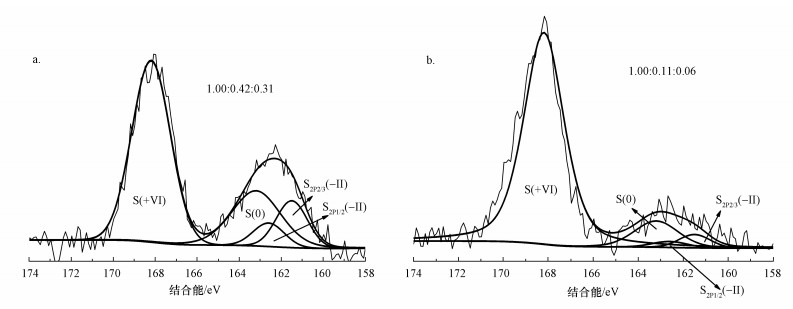 XPS是重要的元素分析技術, 可用于分析硫在化合物中的狀態(tài)及結合方式.如圖 6所示, MFC陽極沉積物和懸浮物的XPS S2p譜圖上有2個特征峰, 這2個峰的歸屬通過與文獻譜圖比較后而得到確認(https://srdata.nist.gov/xps/).159~166 eV處的寬峰通過解疊化分成一個雙峰和一個單峰:在161.5 eV和162.6 eV處的S2p3/2-1/2雙峰屬于S2-, 而163.2 eV處的S2p3/2單峰被歸于S0, 168.2 eV處的S2p3/2寬峰則是S6+的特征峰.陽極懸浮物XPS各個峰S6+:S0:S2-的相對峰面積比為1:0.42:0.31, 陽極沉積物的S6+:S0:S2-的相對峰面積比為1:0.11:0.06.懸浮物與沉積物相比, 懸浮物中S0含量比例較高, 而沉積物中S6+比例較高.可能是硫化物及硫沉積在碳纖維絲后易于進一步氧化, 因此, 如何控制碳纖維絲上的硫進一步氧化是回收硫的關鍵.Sun等(2009)采用以碳紙為陽極的MFC處理含S2-廢水的研究發(fā)現(xiàn), 在進水S濃度為133 mg·L-1條件下, 48 h時非生物MFC陽極沉積物中S6+:S0:S2-的相對峰面積比為1:0.93:0.46;隨著時間延長, S0比例增加而S2-比例減小.相比本試驗采用的碳刷陽極, Sun等(2009)采用的碳紙陽極具有較小表面積和較少的電化學作用位點, 使S0和S2-氧化為S6+的電化學推動力低于本研究, 因此, 其S0和S2-比例高于本試驗結果.