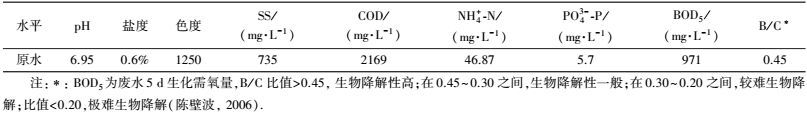 廢水來自于某煙草公司, 該公司產(chǎn)生的廢水黃褐色, 渾濁并伴有典型煙草氣味.廢水基本理化參數(shù)檢測按照《水和廢水監(jiān)測分析方法》規(guī)定進行(國家環(huán)保局, 1997) .其中COD、色度、懸浮物(SS)采用便攜式水質(zhì)分析儀(DR1900, 美國Hach公司)進行測定;生化需氧量(BOD5)采用BOD測試儀(美國Hach公司)進行測定;pH值采用pH電極法測定, pH計(FE20, Mettler Toledo);鹽度采用折光率法進行測定, 鹽度計(手持式鹽度儀, 南京山特公司);氨氮含量采用納式試劑分光光度法(GB 7497-87) 測定;可溶性磷酸鹽采用鉬酸銨分光光度法(GB 11893-89) 測定.