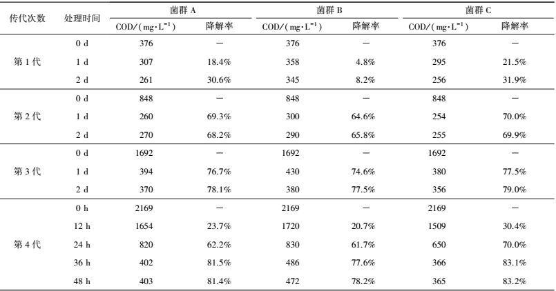 根據(jù)廢水的性質(zhì)和污染類型, 選取污水處理廠污泥樣品, 以逐步提高污染物負荷的方式篩選馴化具有高效降解功能的菌群(Gong et al., 2009), 在操作過程中通過調(diào)整廢水的稀釋倍數(shù)實現(xiàn)污染物濃度梯度逐步提高、增加馴化壓力的目的.10 g污泥樣品加入到稀釋4倍的100 mL廢水中, 180 r·min-1、30 ℃培養(yǎng)4 d后轉(zhuǎn)接到稀釋倍數(shù)為2的廢水中, 逐步提高濃度至不稀釋廢水培養(yǎng)基中, 不斷馴化菌群活性和環(huán)境耐受能力, 測定處理污水過程中COD濃度變化, 篩選降解效率最高的功能菌群.