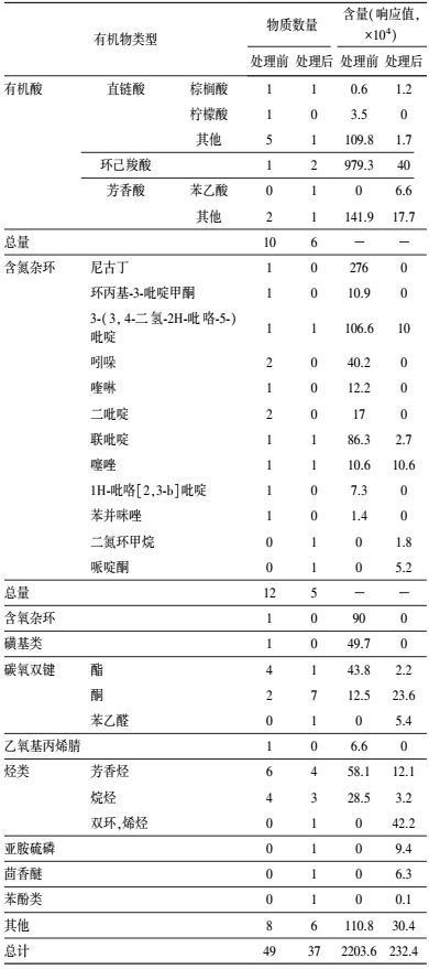 去除空白樣品中有機物后, 將處理前后廢水有機物組成和含量列于表 3中.整體上分析處理后廢水中污染物含量是處理前10%~15%, 顯著下降, 降解率接近90 %, 這與COD的降解率基本相符, 說明污染物種類含量和COD指標正相關(guān).污染物種類也從降解前的49種變?yōu)榻到夂蟮?7種.從結(jié)果可以看出, 處理后有機酸的種類由10種降至6種且相對含量由1235×104降至67×104, 有機酸被有效降解, 與處理后pH有所上升對應(yīng), 并且有機酸是煙葉組成中重要的香氣化合物(王利杰等, 2007), 這也是經(jīng)菌群處理后廢水的氣味減弱的原因之一.此外, 處理后廢水中的含氧雜環(huán)和磺基類物質(zhì)被完全降解;在處理后的廢水中酯類和芳香烴的種類和相對含量均有所下降, 酯類化合物的種類由4種減少到1種, 相對含量由43.8×104降低為2.2×104;芳香烴的種類由6種減少到4種, 相對含量由58.1×104降至12.1×104.處理后酮醛類物質(zhì)含量豐富, 并出現(xiàn)醚、烯烴和苯酚.