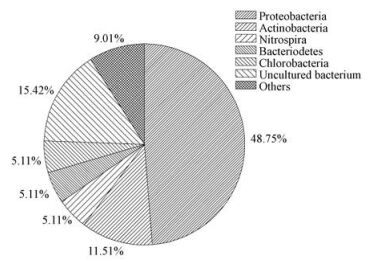 菌群的克隆文庫中的克隆主要屬于細菌域的7個主要類群, 如圖 3所示, 變形菌門(Proteobacteria)占有最大比例為48.75%, 其次為放線菌門 (Actinobacteria)占到總數(shù)的11.51%.另外還包含硝化螺旋菌門 (Nitrospira), 擬桿菌門 (Bacteriodetes), 綠彎菌門 (Chlorobacteria)等. 具體參見污水寶商城資料或http://wlmqsb.com更多相關(guān)技術(shù)文檔。