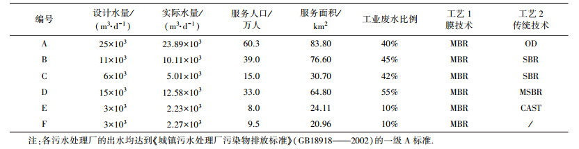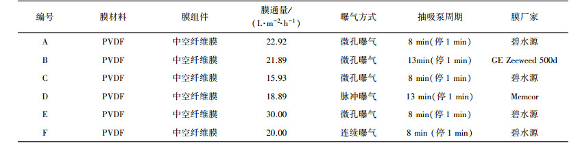 為研究MBR工藝與傳統(tǒng)工藝在去除抗生素抗性菌效果的差異性, 本文選擇位于無錫市的6座污水處理廠, 對其進(jìn)出水中的抗生素抗性菌進(jìn)行調(diào)查, 并依次編碼為A、B、C、D、E及F廠, 各污水處理廠分別設(shè)計3個采樣點(F廠為2個采樣點):1號采樣點位為污水處理廠的沉砂池出水(同一個污水廠的2種水處理工藝進(jìn)水水質(zhì)相同), 即生化池進(jìn)水;2號采樣點位為MBR工藝膜池出水;3號采樣點位為傳統(tǒng)工藝出水, 其中, A廠出水為二沉池出水, E廠出水為轉(zhuǎn)盤過濾器出水, 其它廠均為濾布濾池出水, 且為了減少不同消毒處理工藝帶來的差異性, 所有出水未經(jīng)過消毒處理.各污水處理廠情況如表 1所示.其中, MBR工藝均為AAO工藝與膜反應(yīng)器的組合形式, 膜生物組件采用中空纖維膜, 膜材料為常見的聚偏氟乙烯(PVDF), 孔徑大小 < 0.5 μm, 并采用抽吸泵抽吸的方式運行.膜組件的具體信息如表 2所示.