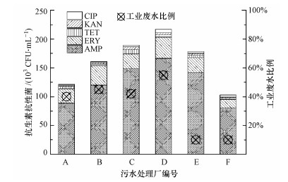 本研究調(diào)查的目標(biāo)污水處理廠進(jìn)水中, D廠包括兩家大型醫(yī)院的排水, E廠進(jìn)水中含有制藥廢水, A、B、C、F廠的進(jìn)水中只包含小型社區(qū)醫(yī)院的廢水排放.對照圖 1可知, D廠的總抗生素抗性菌數(shù)量最多, 很可能是由于進(jìn)水中含有較多醫(yī)院廢水和工業(yè)廢水導(dǎo)致, 醫(yī)院廢水中常常含有較高濃度的抗生素(Lindberg et al., 2004; Huang et al., 2011).研究認(rèn)為, 在長期的抗生素驅(qū)動壓力下可能誘發(fā)細(xì)菌進(jìn)行選擇性基因突變和基因水平轉(zhuǎn)移(Heuer et al., 2007), 從而增加抗生素抗性菌的數(shù)量(Accinelli et al., 2007).E廠雖然工業(yè)廢水比例較低(10%), 但由于進(jìn)水中含有制藥廢水, 導(dǎo)致其抗生素抗性菌的濃度也較高.由此說明抗生素抗性細(xì)菌的含量分布與區(qū)域周邊生活污水、工業(yè)廢水的排放及人類活動等因素密切相關(guān), 此觀點得到Xu等(2015)認(rèn)同.