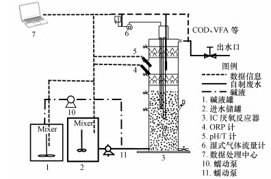 為獲得不同進水條件下廢水厭氧降解有機物出水VFA濃度以及處理的效果, 在實驗室搭建一套廢水厭氧處理系統(tǒng).實驗裝置如圖 1所示, 實驗所用的IC厭氧反應器為有機玻璃制作, 高1272 mm, 內徑200 mm, 有效容積25.1 L, 第一反應區(qū)與第二反應區(qū)的體積比為4:1, 廢水通過BT600-2J型蠕動泵輸送至反應器內, 水質參數(shù)在線監(jiān)測系統(tǒng)由在線pH儀表(美國哈希公司, GLI MODEL33)、在線ORP儀表(GOLDTO TP560)、PT100溫度傳感器(u2p-010) 和濕式氣體流量計(LML-1型)組成.反應器經(jīng)過3個月成功啟動, 接種污泥為廣州某造紙廠IC反應塔厭氧顆粒污泥, 其總固體懸浮物(TSS)為112.56 g·L-1, 揮發(fā)性懸浮物(VSS)為132.04 g·L-1, VSS/TSS為0.852.
