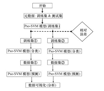 如圖 3所示.元數(shù)據(jù)分成測試集和訓練集, 訓練集用于建立模型, 測試集用于驗證模型.將訓練集數(shù)據(jù)用于pso-SVM-regression模型建模, 根據(jù)建模輸出數(shù)據(jù)與訓練集輸出量的相對誤差將訓練集分成兩個訓練集(訓練集① 及訓練集②), 并標記訓練集①、② 的元數(shù)據(jù)標簽分別為1、-1;根據(jù)分成的兩類訓練集, 利用pso-SVM-classification模型將測試集分成兩類, 從而將元數(shù)據(jù)分成了兩個數(shù)據(jù)集;再利用SVM-Regression分別對數(shù)據(jù)集進行處理, 將經(jīng)分類和未分類的模型表現(xiàn)進行分析總結.