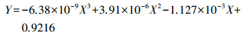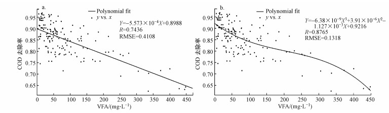 一次多項式線性擬合線性相關性系數(shù)為0.7476, 均方根誤差RMSE為0.4108;如圖 4b所示, 三次多項式擬合VFA-COD去除率的表現(xiàn)來看, VFA-COD去除率之間的聯(lián)系可用公式(5) 表示: