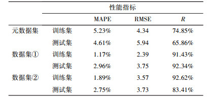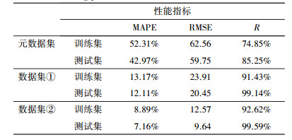 數(shù)據(jù)集分為訓練集和測試集, 其中訓練集共100組數(shù)據(jù), 測試集共59組數(shù)據(jù).模型運行開始后, 根據(jù)模型針對訓練集的輸出量與實際值之間的誤差將訓練集平分為兩個訓練集(訓練集① 及訓練集②), 經(jīng)過pso-SVM-classification模型將測試集分成兩類測試集(測試集① 及測試集②), 至此, 元數(shù)據(jù)集分類成兩類數(shù)據(jù)集:數(shù)據(jù)集①:訓練集共50組數(shù)據(jù)、測試集共32組數(shù)據(jù);數(shù)據(jù)集②:訓練集共50組數(shù)據(jù)、測試集共27組數(shù)據(jù).