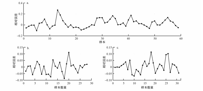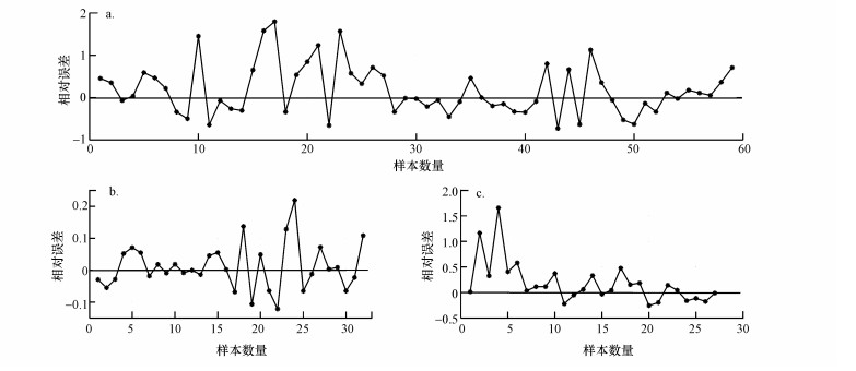 廢水厭氧處理系統(tǒng)VFA濃度預測仿真結果見表 2及圖 7.通過分析圖 7a, pso-SVM模型對廢水厭氧處理系統(tǒng)VFA濃度具有較好的預測仿真能力, 但是當水質變化較大時, 模型存在欠擬合的問題, 局部表現(xiàn)較差.對比分類前后的模型表現(xiàn), 通過對比圖 7a與圖 7b、圖 7c, 模型在數(shù)據(jù)集分類后的性能表現(xiàn)提升較大.分類之前, 模型的各性能指標(測試集)RMSE為59.75, MAPE為42.97%, 相關性R為85.25%;分類之后, 數(shù)據(jù)集① 及數(shù)據(jù)集集② 的性能指標分別為:RMSE為20.45、9.64, MAPE為12.11%、7.16%, 相關性R為99.14%、99.59%.圖 8表示的是模型仿真結果與實驗值的相對誤差, 模型分類前相對誤差最大為179.47%, 分類后相對誤差最大分別為21.91%、165.85%.從圖 8可以看出, 元數(shù)據(jù)集分類后模型對個別樣本單元的預測表現(xiàn)依然不夠理想, 若要針對每個樣本集獲得更為精確的預測結果, 需要優(yōu)化模型的核函數(shù)、分類策略等(Cao et al., 2016), 這也是未來的研究方向.