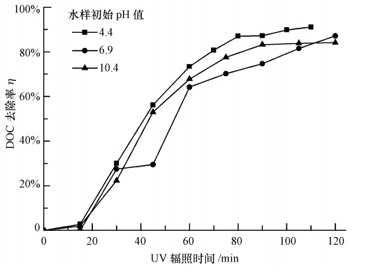 礦化率即DOC去除率(η)計(jì)算公式為:η=(C0-Ct)/C0×100%,其中,C0、Ct分別為初始及反應(yīng)t時(shí)刻的水樣DOC濃度(mg · L-1).