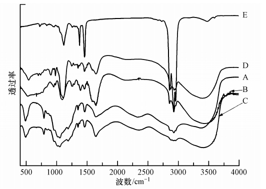 對(duì)5種去污劑進(jìn)行了紅外光譜的定性分析,結(jié)果見(jiàn)圖 7.由圖可知,5種去污劑的紅外光譜圖各不相同,但有些去污劑的主要吸收峰有類似的特征.例如,去污劑A~D均在1645 cm-1和1458 cm-1處有較強(qiáng)吸收,此位置可能是COO-的特征吸收,而去污劑E的紅外光譜中無(wú)此吸收峰;去污劑B和C分別在3420 cm-1和1060 cm-1處有較強(qiáng)吸收;去污劑D和E在1100 cm-1處有較強(qiáng)吸收.但因去污劑成分復(fù)雜,僅從紅外譜圖很難推測(cè)去其成分.但結(jié)合圖 5,可以推斷去污劑的成分和主要官能團(tuán)的差異將導(dǎo)致UV/H2O2氧化效果的不同.
