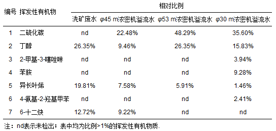各單元作業(yè)廢水中主要PTC-GC/MS監(jiān)測結果見表 2.各單元作業(yè)廢水中φ45 m濃密機溢流水、φ53 m濃密機溢流水、φ30 m濃密機溢流水均檢測出CS2.CS2在水中的溶解度為0.201%(20 ℃),易溶于醇類,若水體中存在醇類等有機物,根據(jù)相似相溶原理,將增大水體中CS2的含量.