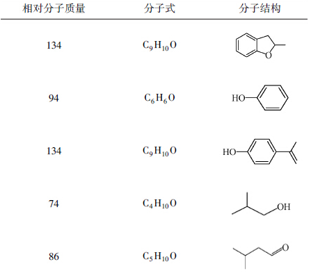 紫外吸收光譜的結(jié)果表明,在降解過(guò)程中,有機(jī)污染物的特征吸收峰逐漸消失,且沒(méi)有產(chǎn)生新的吸收峰,近紫外區(qū)的吸光度逐漸趨于零.說(shuō)明溶液中的有機(jī)污染物逐漸被降解為小分子飽和烷烴、CO2和H2O.為了進(jìn)一步研究有機(jī)物的降解歷程,利用GC-MS對(duì)BPA和PNP進(jìn)行中間產(chǎn)物的分析,結(jié)果見(jiàn)表 1和表 2.