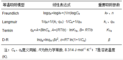 表 2 常見等溫吸附模型線性表達(dá)式