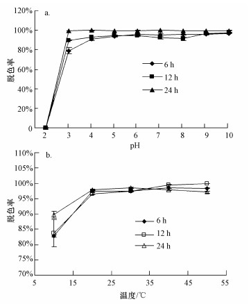 pH值和溫度對孔雀石綠脫色的影響如圖 2所示.當(dāng)培養(yǎng)時(shí)間達(dá)到6 h后, 菌株CV-v在pH=3.0~10.0之間對孔雀石綠的脫色率均在80%以上, 而當(dāng)培養(yǎng)時(shí)間達(dá)到12 h后, 該菌株對孔雀石綠的脫色率維持在90%以上.隨著培養(yǎng)時(shí)間的延長, 當(dāng)培養(yǎng)時(shí)間超過24 h后, 該菌株在pH=3.0~10.0之間可完全脫色孔雀石綠.安賢惠等(2013)的研究中分離了一株Aeromonas屬的菌株, 該菌株對100 mg·L-1孔雀石綠的脫色率達(dá)到96.9%需要48 h以上的培養(yǎng)時(shí)間;Lv等(2013)的研究發(fā)現(xiàn), 菌株Deinococcus radiodurans R1對孔雀石綠的脫色效果在pH 6.0~8.0之間時(shí)最優(yōu), 而當(dāng)pH值低于6.0或高于8.0時(shí), 該菌株對孔雀石綠的脫色率則急劇下降;本課題組以往的研究中分離的菌株Enterobater sp. DH9在pH=3.0~9.0之間時(shí), 也需培養(yǎng)24 h以后, 對孔雀石綠的脫色率才能維持在90%以上.與以往已報(bào)道菌株相比, 本研究中的菌株CV-v在pH=3.0~10.0之間對孔雀石綠的12 h脫色率在90%以上, 脫色優(yōu)勢顯著, 環(huán)境適應(yīng)性強(qiáng), 具有廣闊的應(yīng)用前景.