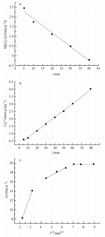 圖 8 不同動(dòng)力學(xué)模型的吸附擬合(a.準(zhǔn)一級(jí)動(dòng)力學(xué)模型, b.準(zhǔn)二級(jí)動(dòng)力學(xué)模型, c.顆粒內(nèi)擴(kuò)散模型)
