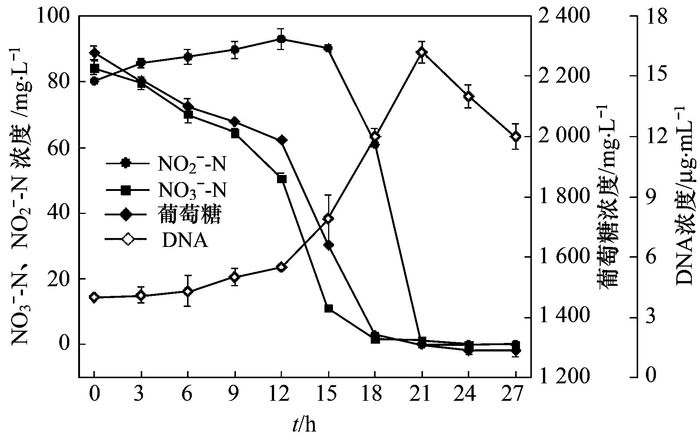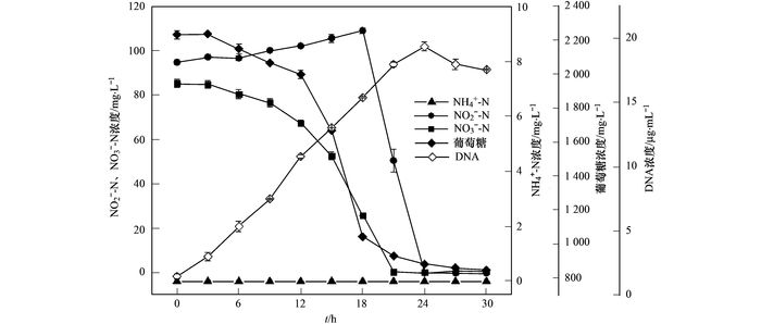 NH4+-N、NO2--N、NO3--N濃度采用美國DIONEX IC S-2000離子色譜儀進行定量分析, 離子交換柱為Dionex IonPac AS18-4 μm, 柱溫30℃, 流速1.0 mL·min-1; 葡萄糖濃度采用美國Agilent公司HPLC 1260 Inifinty高效液相色譜儀進行定量分析, 所用色譜柱為BIO-RAD Amenix HP 76X, RID檢測器(50℃), 柱溫80℃, 流速0.8 mL·min-1; 菌體生長用DNA濃度(μg·mL-1)表示, 用美國Thermo公司Nanodrop Spectrophotometer 1000分光光度計測量.