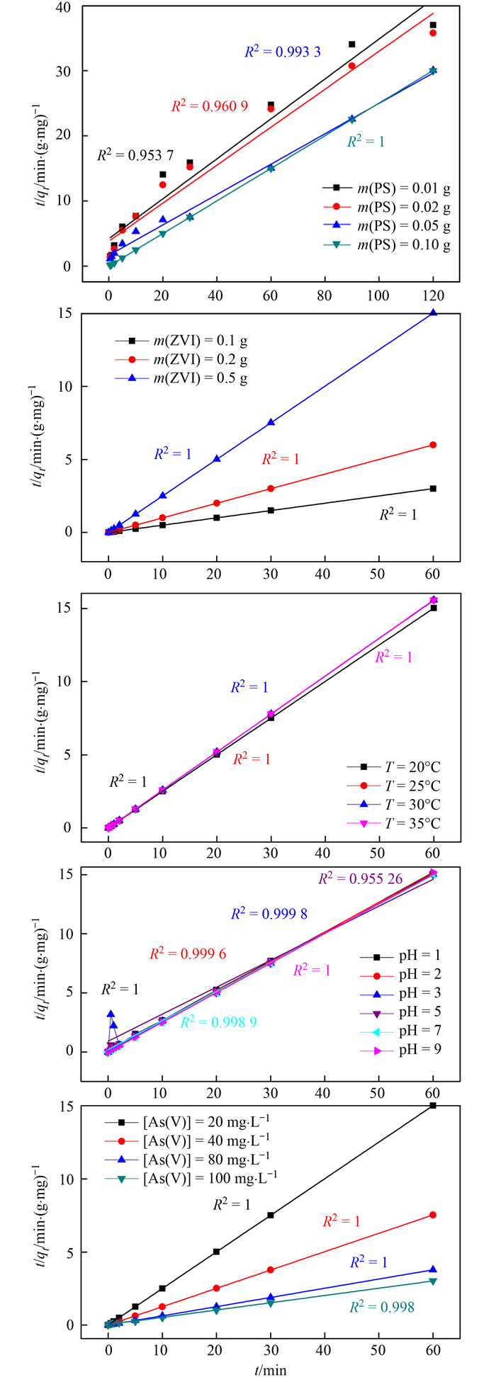 通過對實驗數(shù)據(jù)進行擬合, 結(jié)果如圖 3所示.隨著反應(yīng)時間t的增加, t/qt也在同比例增加, 不同反應(yīng)條件擬合后的曲線R2均大于0.95.因此, ZVI活化PS去除As(Ⅴ)溶液的反應(yīng)過程符合準二級動力學(xué)方程.