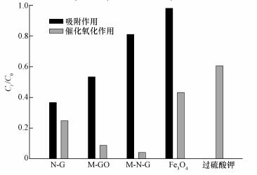 為了選擇最佳的材料作為催化劑, 分別調(diào)查了氮摻石墨烯(N-G, 5 mg)、磁性氧化石墨烯(M-GO, 10 mg)、磁性氮摻石墨烯(M-N-G, 10 mg)、Fe3O4(10 mg)作為吸附劑和催化劑, 以及單獨(dú)加入過硫酸鉀(0.4 mmol·L-1)處理亞甲基藍(lán)的效果.從圖 5可以看出, N-G的吸附效果最好, 這主要是因?yàn)樵摬牧现惺┑谋壤罡?M-N-G的催化性能最好, 稍微優(yōu)于M-GO的催化效果, 這是因?yàn)榈獡教幚? 引入氮原子進(jìn)入到GO的結(jié)構(gòu)中, 一方面提高了GO的導(dǎo)電性, 另一方面增加了GO的缺陷結(jié)構(gòu), 更利于電子的傳輸(蘇鵬等, 2012;王金雙等, 2017).單獨(dú)的Fe3O4的吸附和催化效果都不具備優(yōu)勢, 但和只加入過硫酸鉀相比, 加入Fe3O4后, 降解率有所增大, 說明Fe3O4具備一定的催化效果, 該結(jié)果和之前趙進(jìn)英研究報(bào)道一致(2010).綜上比較, 在后續(xù)的實(shí)驗(yàn)中采用M-N-G作為催化劑.