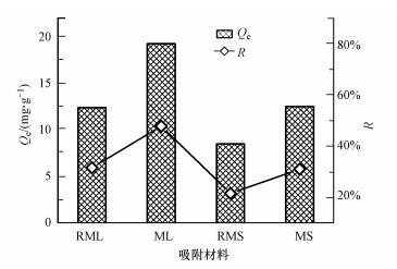 在200 mL 10 mg·L-1的亞甲基藍(lán)溶液中添加RML、ML、RMS、MS 4種吸附材料后, 在(25±1) ℃條件下以150 r·min-1的轉(zhuǎn)速振蕩40 min, 其對亞甲基藍(lán)的吸附性能比較如圖 3所示.結(jié)果顯示:經(jīng)過水熱炭化, 玉米葉對亞甲基藍(lán)的吸附量由12.38 mg·g-1增加到19.19 mg·g-1, 增加了54.95%, 去除率由31.64%提高到47.78%, 提高了51.03%;玉米桿對亞甲基藍(lán)的吸附量由8.49 mg·g-1增加到12.48 mg·g-1, 增加了47.04%, 去除率由21.68%提高到31.08%, 提高了43.32%.這主要是由于經(jīng)過水熱炭化, 生物質(zhì)表面的官能團(tuán)被更多的暴露出來(圖 2a), 更加有利于亞甲基藍(lán)的吸附.