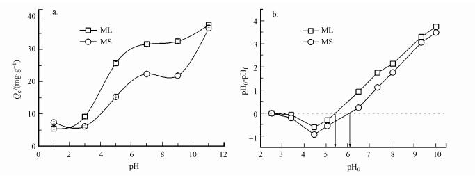 溶液初始pH同樣是影響水中生物炭吸附污染物的一個重要因素, 這主要是因為pH值不僅決定著溶液中污染物的質(zhì)子化狀態(tài), 同時也影響到吸附劑表面的電荷狀態(tài)(吳海露等, 2015).不同pH條件下2種生物炭在對亞甲基藍(lán)溶液的吸附效果如圖 5a所示.由圖可知, 2種生物炭對亞甲基藍(lán)的平衡吸附量變化趨勢相似, 在所研究范圍內(nèi)均隨著pH值的升高而明顯增加, 在堿性環(huán)境中的吸附能力強(qiáng)于酸性環(huán)境.這主要是由于亞甲基藍(lán)在溶液中以陽離子形式存在, 在較低pH時, 溶液中存在較多的H+, 會與亞甲基藍(lán)陽離子在生物炭表面競爭活性吸附位點(diǎn);隨著pH值的增加, OH-濃度增大, 當(dāng)溶液pH值增加到大于2種生物炭表面的零點(diǎn)電位(根據(jù)圖 5b可知, 玉米葉基生物炭為5.40, 玉米桿基生物炭為6.10) 時, 生物炭表面呈負(fù)電狀態(tài)而與溶液中的亞甲基藍(lán)正離子通過靜電作用相互吸引, 從而增強(qiáng)了生物炭對亞甲基藍(lán)的吸附性能.Fan等(2016)研究的城市污泥和茶葉廢物生物炭對亞甲基藍(lán)的吸附也表現(xiàn)出相似的規(guī)律.